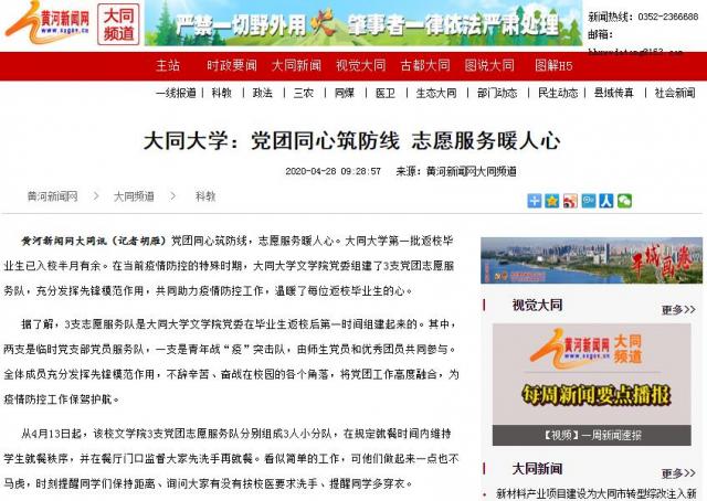 黃河新聞網(wǎng)大同訊(記者胡雁)黨團(tuán)同心筑防線,志愿服務(wù)暖人心。大同大學(xué)第一批返校畢業(yè)生已入校半月有余。在當(dāng)前疫情防控的特殊時(shí)期,大同大學(xué)文學(xué)院黨委組建了3支黨團(tuán)志愿服務(wù)隊(duì),充分發(fā)揮先鋒模范作用,共同助力疫情防控工作,溫暖了每位返校畢業(yè)生的心。