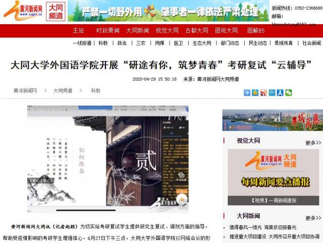 黃河新聞網(wǎng)大同訊(記者趙穎)為切實給考研復(fù)試學(xué)生提供研究生復(fù)試、調(diào)劑方面的指導(dǎo),幫助受疫情影響的考研學(xué)生增強(qiáng)信心,4月27日下午三點,大同大學(xué)外國語學(xué)院以網(wǎng)絡(luò)會議的形式組織開展了2020年“沿途有你,筑夢青春”考研復(fù)試“云輔導(dǎo)”。會議由大同大學(xué)外國語學(xué)院團(tuán)委副書記楊玲主持,優(yōu)秀青年教師段捷、頊丹萍、趙靜老師主講,16級所有考研過線的同學(xué)參加本次會議。