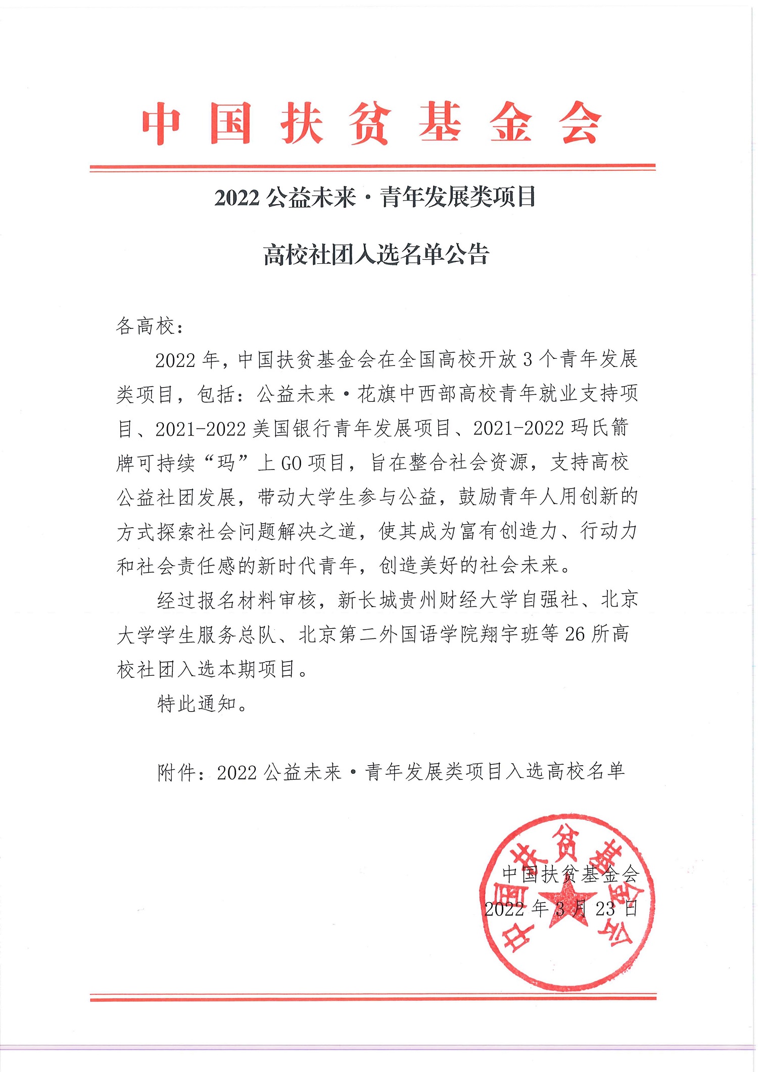 中國(guó)扶貧基金會(huì)今年共收到來(lái)自全國(guó)30個(gè)省(自治區(qū)、直轄市)、360所學(xué)校、457個(gè)學(xué)生社團(tuán)的申請(qǐng)。經(jīng)過(guò)數(shù)月的申報(bào)準(zhǔn)備與待審工作,公益未來(lái) · 青年發(fā)展類項(xiàng)目組綜合社團(tuán)實(shí)力、既往合作經(jīng)驗(yàn)、學(xué)校支持力度等因素最終確定26所高校社團(tuán)入選名單。其中山西省共有3所高校項(xiàng)目申報(bào)成功,我校申報(bào)的青年環(huán)保包裝創(chuàng)新項(xiàng)目位列其中。