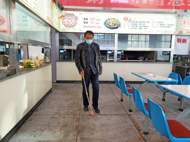 早上六點,天剛蒙蒙亮,宿管阿姨和大爺們按照1瓶消毒液 1壺水的比例進行配比,開始了一天的第一次消殺工作。一桶配好的消毒水大概有40斤,從一樓到六樓,全部消毒完成,需要半個小時,這樣的工作一天兩次,一周七天,從不間斷。如月苑四號樓的大爺說,背著40多斤的消毒設備上下樓梯,對他的體力也是一種考驗,但這是他的工作,是疫情防控的需要,絕對不能含糊。宿管阿姨們負責用酒精擦拭門把手、樓梯欄桿等所有同學們容易觸碰到的部位,一寸一寸、一處一處,耐心細致不落下任何一個角落。如果說大爺做的是體力活,那阿姨就做的是精細活,他們都在用自己力所能及的方式共同守衛著公寓的安全。