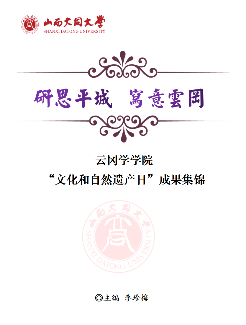 ? 6月11日是我國2022年文化和自然遺產(chǎn)日,今年的遺產(chǎn)日主題是“文物保護:時代共進、人民共享”。為積極響應(yīng)國家號召,營造我校保護文化遺產(chǎn)的良好氛圍,提高廣大師生對文化遺產(chǎn)保護重要性的認(rèn)識,動員人們共同參與、關(guān)注和保護文化遺產(chǎn),全面展示“云岡學(xué)”文物保護的階段性建設(shè)成果,云岡學(xué)學(xué)院《“文化和自然遺產(chǎn)日”成果集錦》面向全校正式刊行。