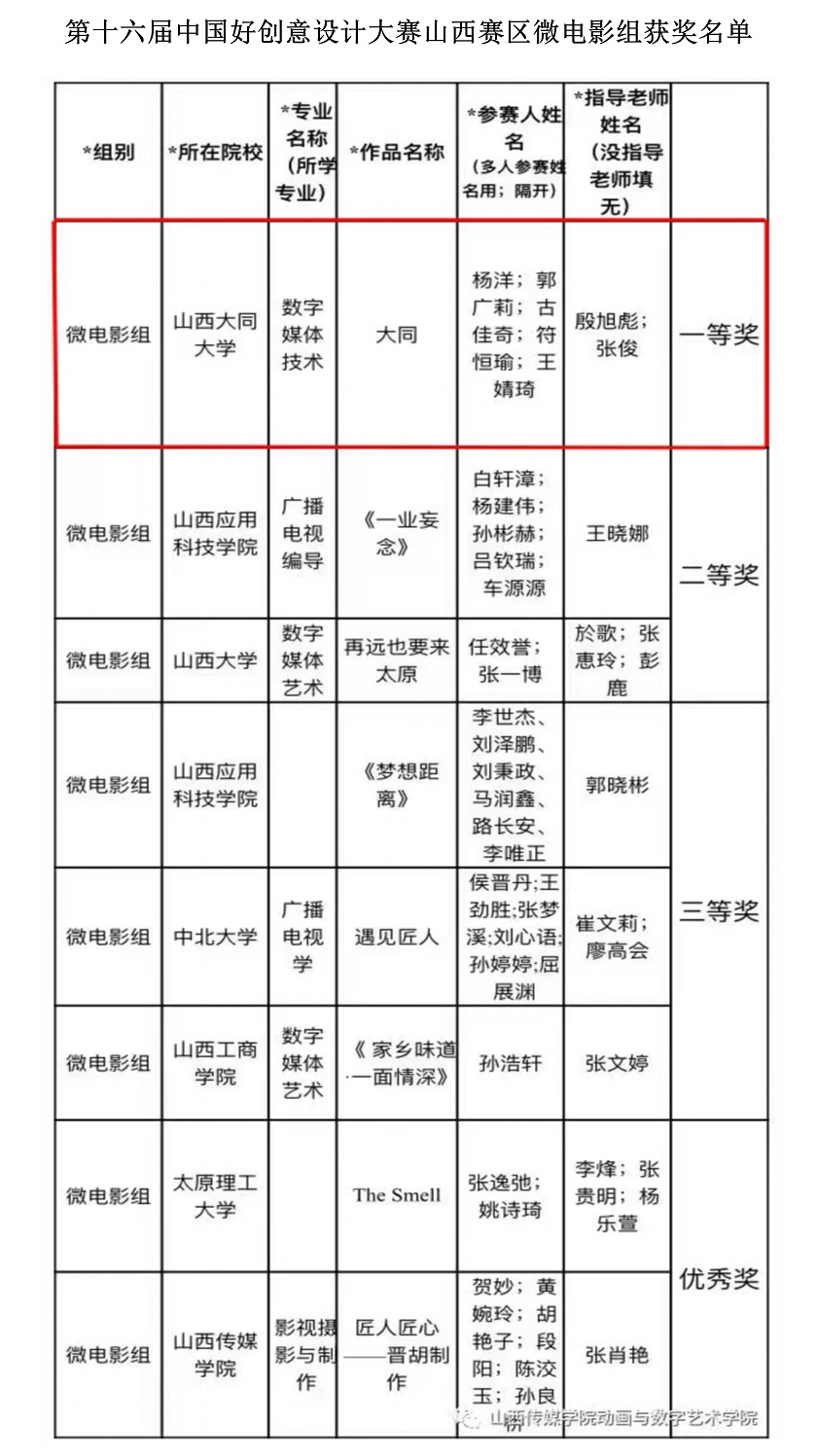 近日,第16屆中國好創意暨全國數字藝術設計大賽山西賽區組委會公布本屆大賽的獲獎名單,在2961件參賽作品遴選出的255件優秀作品中,我校新聞與傳媒學院數字媒體技術專業學生創作的微電影《大同》榮獲一等獎。