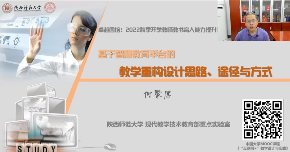 何聚厚教授從海量智慧教育資源背景下教學設計實踐面臨的挑戰和機遇;“學生為中心”智慧教學創新設計的理念;基于智慧教育平臺的智慧教學重構設計思路、途徑和方式三個方面,分享了教學重構設計的思路、途徑及方式。