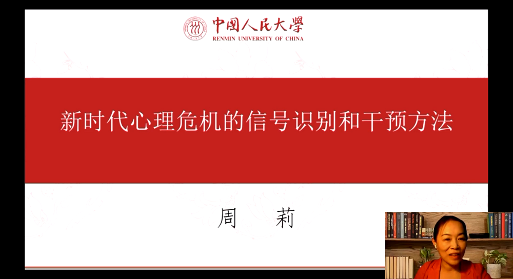 周莉教授從大學生心理危機發展的四個階段、心理危機的信號和誤區、心理危機干預的關鍵要素、干預三步法、和家長溝通的難點和談話方式等幾個方面,分享了新時代心理危機的信號識別和干預方法。