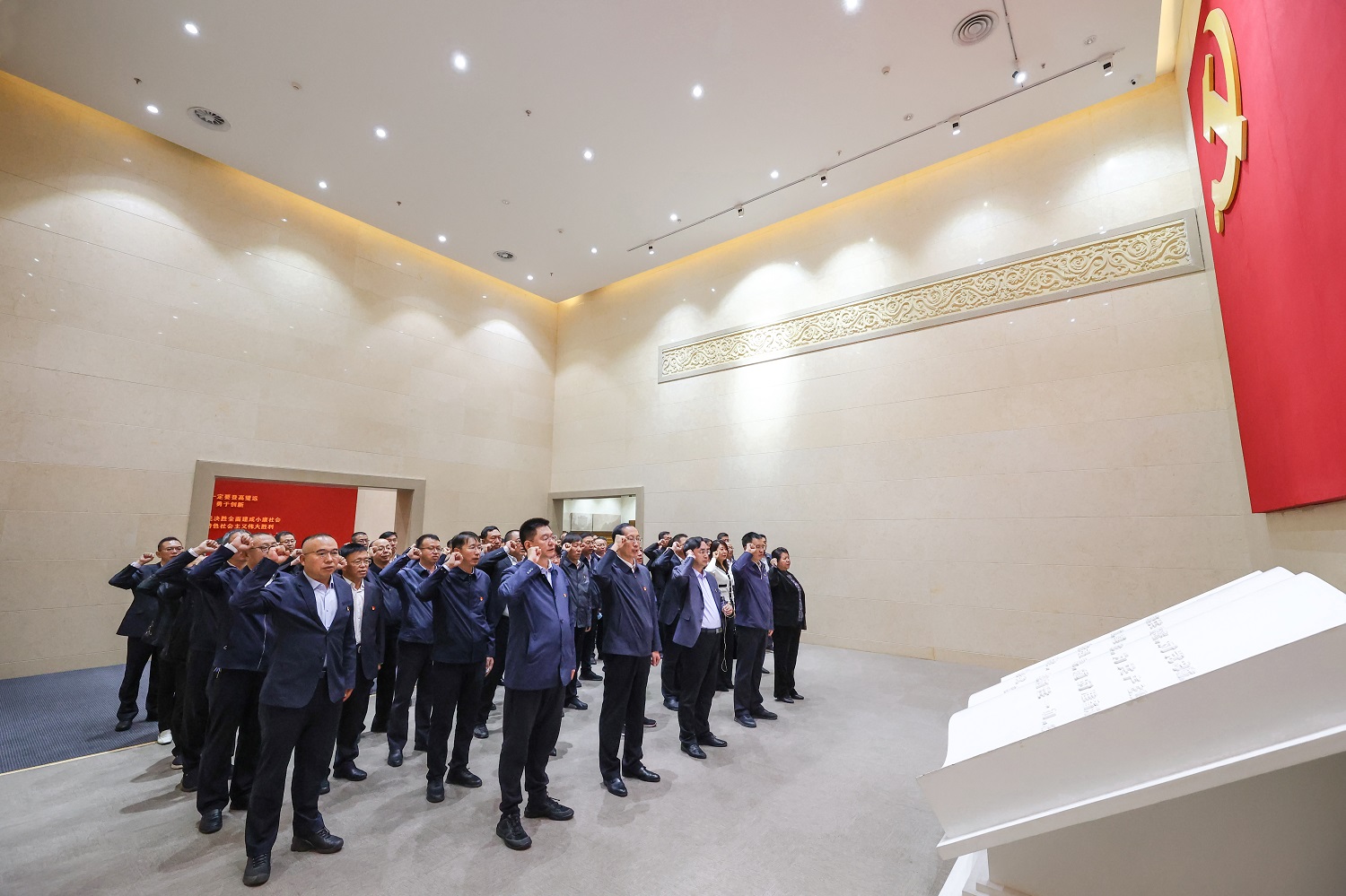 參觀學習后,趙水民帶領學校中層正職以上領導干部在鮮紅的巨幅黨旗下高舉右拳,重溫入黨誓詞:“我志愿加入中國共產黨……隨時準備為黨和人民犧牲一切,永不叛黨。”錚錚誓言,鏗鏘有力,提醒著每位黨員干部要時刻牢記初心使命,堅守廉潔底線,用一生去踐行諾言、守護初心。(文/趙鑫 圖/余致楠)