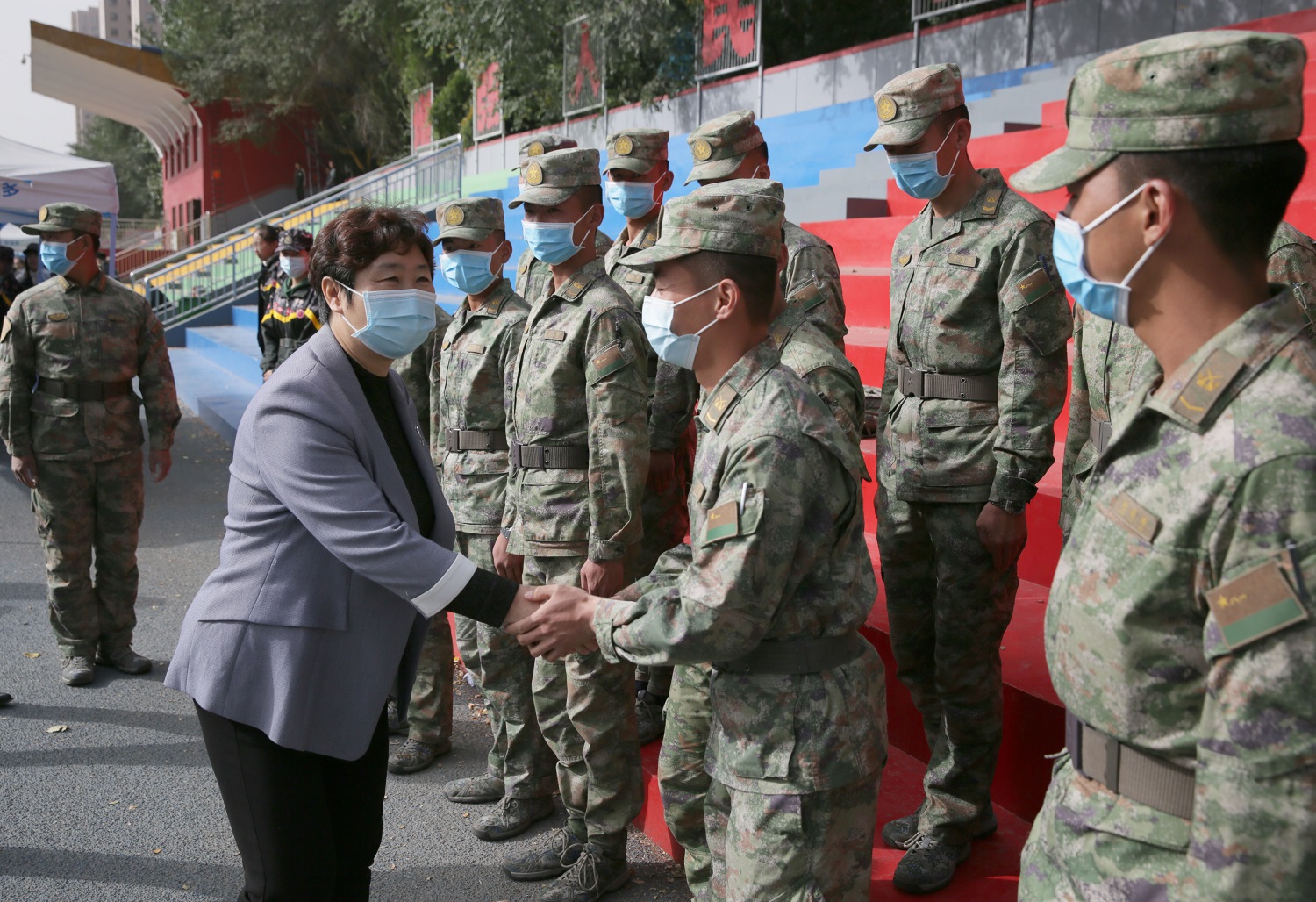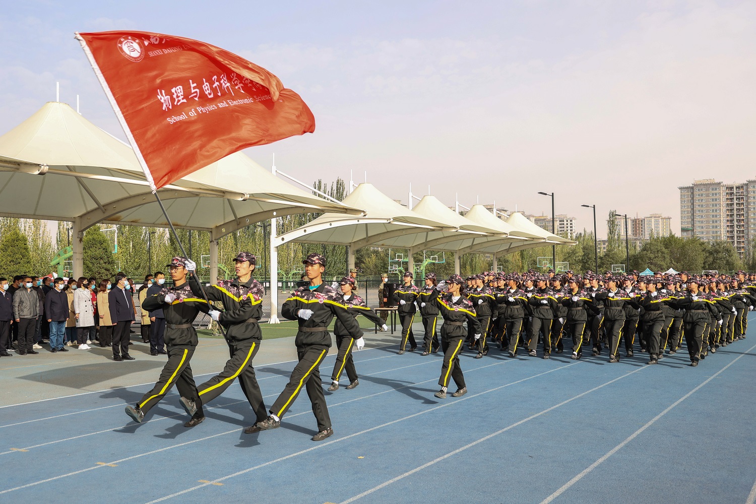 十月的學(xué)校,金風(fēng)送爽,彩旗獵獵,嘹亮的解放軍進(jìn)行曲響徹四方,鮮艷的國旗高高飄揚(yáng)。經(jīng)過了意志和紀(jì)律的考驗(yàn),經(jīng)過了體力和毅力的錘煉,經(jīng)過了汗水和淚水的洗禮,10月8日上午9時(shí),我校2022級(jí)新生軍訓(xùn)成果展示活動(dòng)在御東校區(qū)和新平旺校區(qū)同時(shí)展開。由于受到疫情的影響,上級(jí)主管部門明確要求不搞軍訓(xùn)匯報(bào)表演活動(dòng),我校依據(jù)上級(jí)的指示精神,今年軍訓(xùn)活動(dòng)結(jié)束后不舉辦大型的匯報(bào)表演,各營在各自的軍訓(xùn)場(chǎng)地展示軍訓(xùn)成果,不搞集中展示、不準(zhǔn)人員聚集。御東校區(qū)在學(xué)生訓(xùn)練的南、北校區(qū)操場(chǎng)進(jìn)行展示活動(dòng),校黨委書記趙水民、黨委副書記寇福明在御東校區(qū)隨機(jī)巡視觀摩了部分學(xué)院的軍訓(xùn)成果;新平旺校區(qū)在學(xué)生訓(xùn)練場(chǎng)地操場(chǎng)舉行活動(dòng),校黨委副書記、校長(zhǎng)姚麗英,校黨委常委、副校長(zhǎng)張旻巡視觀摩了新平旺校區(qū)的成果展示活動(dòng)。