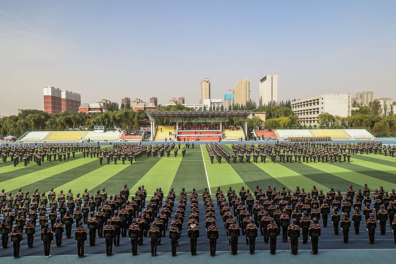 軍體拳方隊(duì)動(dòng)作整齊、沉著有力,“殺”聲響亮、響徹云霄、威震四方,喊出了眾志成城的無悔誓言。第一式弓步?jīng)_拳,弓步穩(wěn)如鐘,沖拳利如鋒。第二式穿喉彈踢,敏銳的反應(yīng),迅速的彈踢。出拳虎虎生威、踢腿凌厲有力,招招干凈利落、整齊劃一、從容灑脫、招數(shù)間轉(zhuǎn)換地干脆利落。這其中展示的是軍人的精神,也是同大人的精神!2144名軍體拳方隊(duì)學(xué)生組成了“大同大學(xué)”4個(gè)顯眼的大字,表達(dá)了2022級(jí)全體學(xué)子對(duì)未來4年象牙塔港灣的熱愛和憧憬之情!