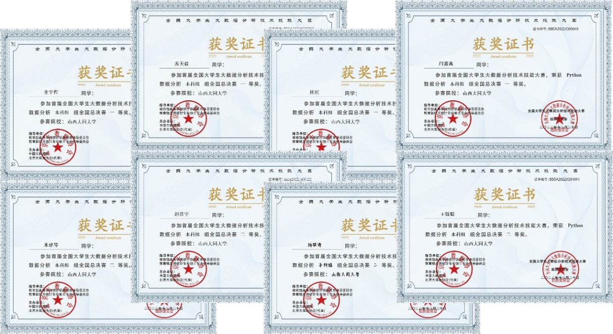 近日,首屆全國大學生大數據分析技術技能大賽全國總決賽圓滿落幕。來自北京大學、南開大學、復旦大學、中央財經大學等400多所高校的千余名省賽一等獎獲獎學生共濟一堂,角逐全國總決賽最高榮譽。計算機與網絡工程學院8名學生組成的山西大同大學代表隊參加了此次全國總決賽。經過激烈角逐,我校8名參賽選手全部獲得了國賽獎項,其中全國一等獎4項,二等獎4項,獲獎率高達100%。據了解,省賽一等獎獲獎學生789人,參加國賽獲得一、二、三等獎分別有222,244,139人,獲獎率分別為28%、30%、17%。