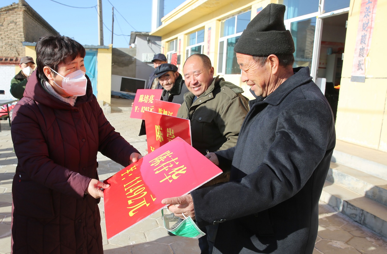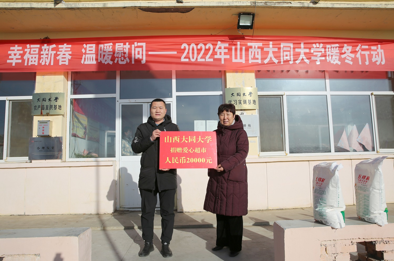 春節將至,幫扶村處處充滿了節日的喜慶氣氛。在分紅儀式上,姚麗英、寇福明、王崇虎為謝莊村、十九墩村的村民代表們一一發放“寒富蘋果、大蔥消費扶貧項目”和羊場的現金分紅,并祝愿鄉親們收入一年比一年高、日子一年比一年好!村民們的喜悅和感恩之情溢于言表:“感謝黨和國家的好政策,感謝總書記的深切關懷,感謝大同大學的真情幫扶!年年都能領到分紅,相信我們的日子會越過越好!”十九墩村村委會和村民為大同大學和大同大學工作隊贈送錦旗,以此感謝學校和駐村工作隊長期以來的傾情幫扶。