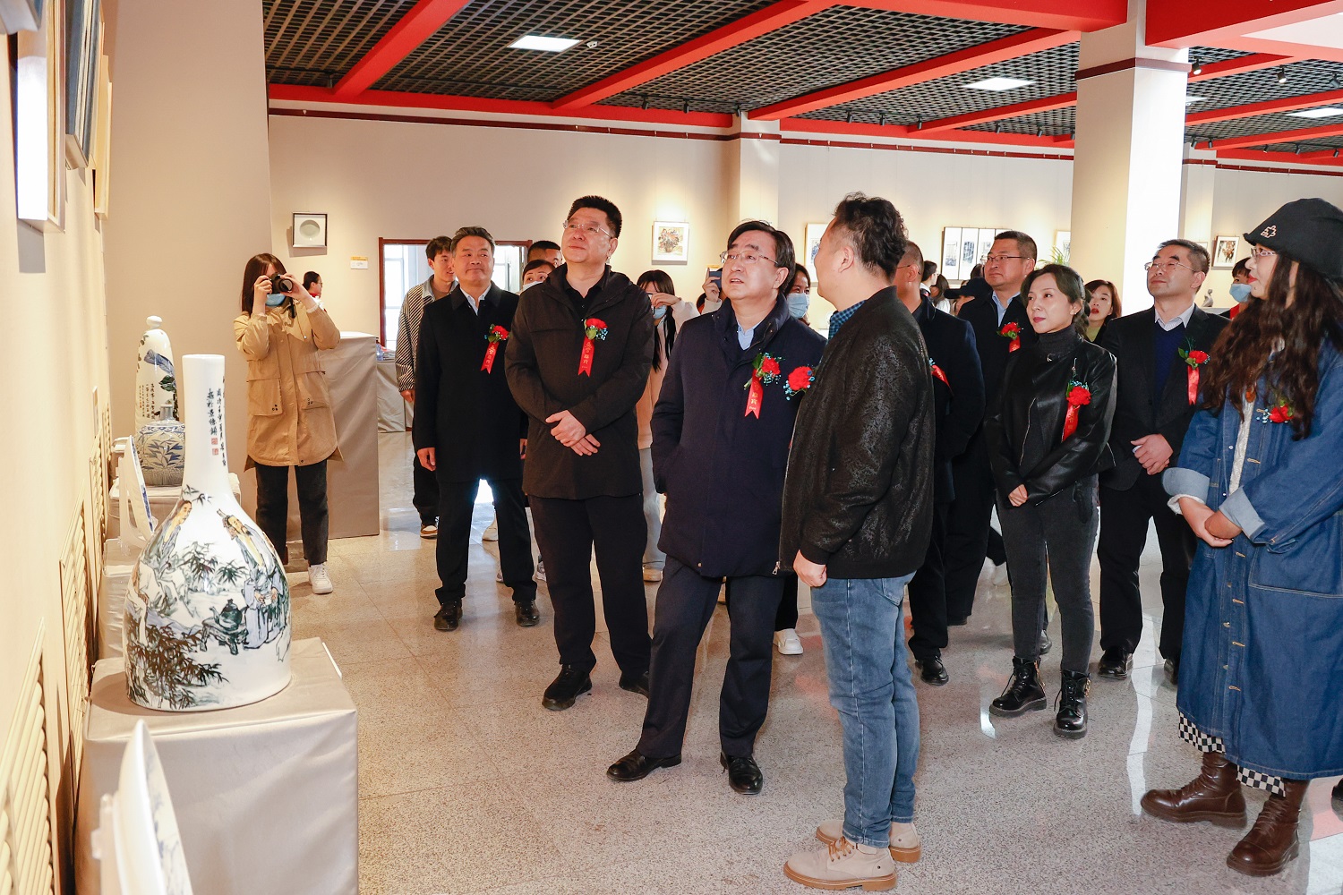 開展儀式結束后,與會領導同師生一起參觀了作品展。趙水民強調,美術學院要通過舉辦各式各類藝術展,讓學生融入藝術氛圍之中,以藝術之美陶冶情操,助力美育教育。要緊密結合創新創業教育,鼓勵學生依托學院平臺,以專業融入市場,利用專業技能促就業、謀發展。要積極引導師生走出去,深入學習發達地區先進的創作思路與理念,“帶回來”廣泛交流,努力創作出兼具藝術價值和經濟效益的作品,為學校轉型發展勇蹚新路。