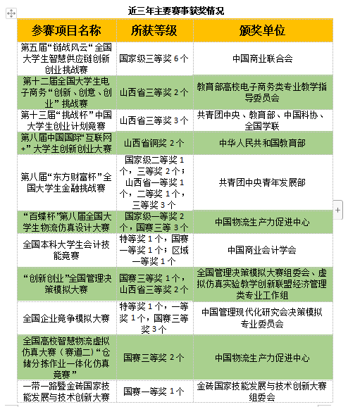 以知識應用型學科與技能競賽為依托,突出“應用型”辦學定位。準確把握學科與技能競賽的功能定位,通過“學賽”互動,推動學校教育教學改革,培養學生的創新能力,增強學生創新意識,全面提高學生綜合素質。近三年來,商學院學子在全國各類大學生競賽中展現風采,勇創佳績,充分凸顯了商學院應用型人才培養成效,獲國家級獎25項和省級獎65項,多項學生競賽位居全省前列,其中在2021年全國會計技能大賽全國總決賽中獲國家級特等獎1項、一等獎1項,位居全國第2和全省應用型本科高校第1;在2021年全國企業競爭模擬大賽全國總決賽中,獲國家級特等獎1項,一等獎1項,位居全省第一;在“百蝶杯”全國大學生物流仿真設計大賽、“一帶一路”暨金磚國家技能發展與技術創新大賽——金磚國家職業技能大賽、“學創杯”全國大學生創業綜合模擬大賽、“挑戰杯”中國大學生創業計劃競賽、中國國際“互聯網+”大學生創新創業大賽、全國大學生電子商務“創新、創意及創業”挑戰賽等全國總決賽中斬獲佳績。