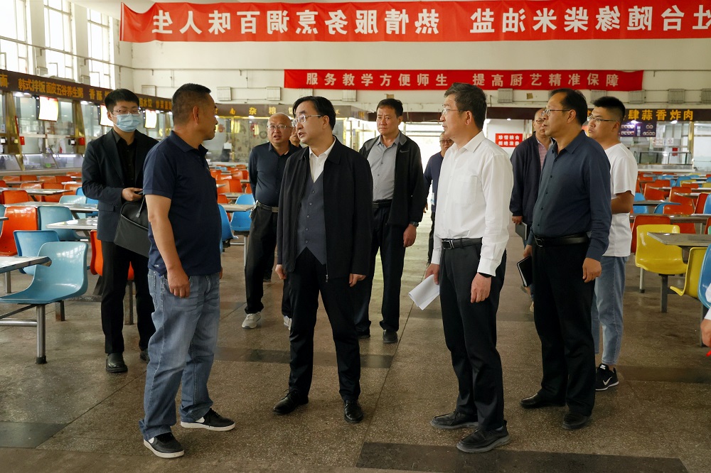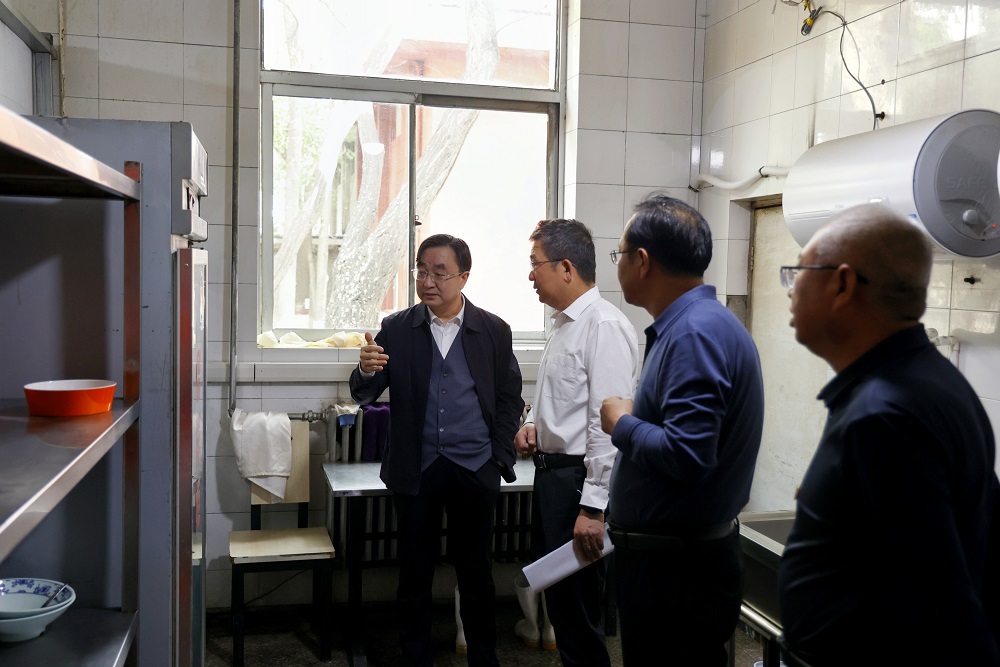 趙水民一行首先深入新平旺校區各食堂,詳細了解查看食材采購、食品儲存、加工制作、食品留樣、餐具消毒、衛生清潔等情況,就做好食品安全工作提出具體要求。他指出,食品安全事關師生身體健康和生命安全,容不得半點馬虎,要深入學習貫徹習近平總書記關于食品安全工作重要論述,加強食品安全監管力度,把好食品安全源頭關。保障食品安全是一項重要民生工程、良心工程,要始終堅持“師生至上、生命至上”工作理念,嚴格落實食品安全“兩個責任”機制,建立健全“從源頭到餐桌”的全鏈條食品安全監管體系,強化底線思維,壓實工作責任,狠抓執行落實,用心用情用力守護好師生“舌尖上的安全”。
