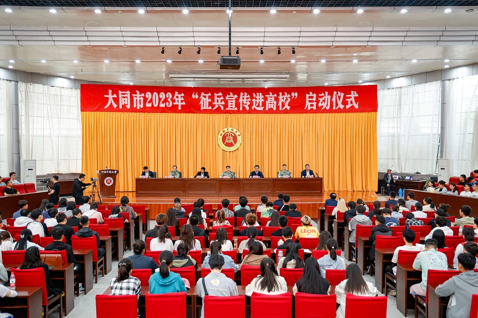 5月30日,大同市2023年“征兵宣傳進高校”啟動儀式在山西大同大學慎思樓科技報告廳舉行。大同市市委常委、軍分區大校司令員劉冬,校黨委副書記寇福明,大同市平城區區委常委、常務副區長陳月祥,大同市軍分區動員處上校處長李玖恒,大同市平城區人武部上校部長萬軍,校軍事教研室主任王成參加啟動儀式。校學生工作部部長楊容主持儀式。