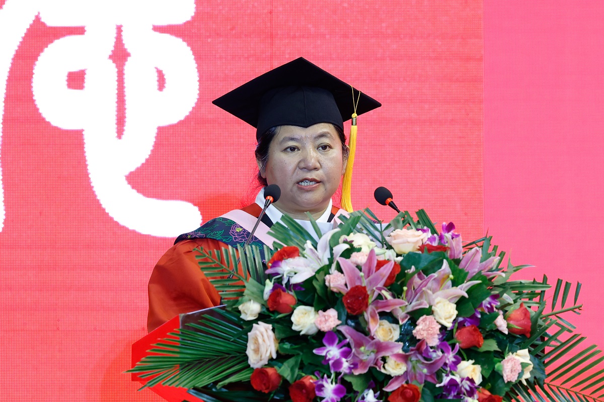 校長、校學位評定委員會主席姚麗英為研究生畢業(yè)生頒發(fā)學位證書。