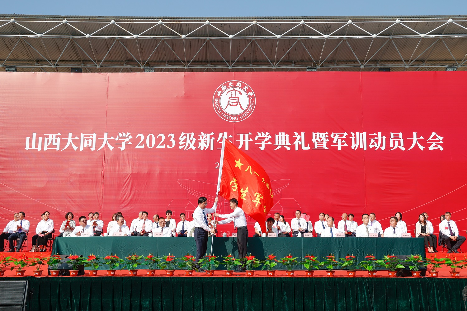 趙水民為山西大同大學(xué)學(xué)生軍訓(xùn)團(tuán)授旗,學(xué)生軍訓(xùn)團(tuán)團(tuán)長(zhǎng)、軍事教育教研部主任王成接旗。
