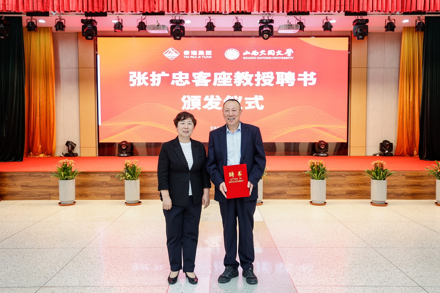 姚麗英為張擴忠頒發(fā)聘書,聘請張擴忠為山西大同大學(xué)“客座教授”。