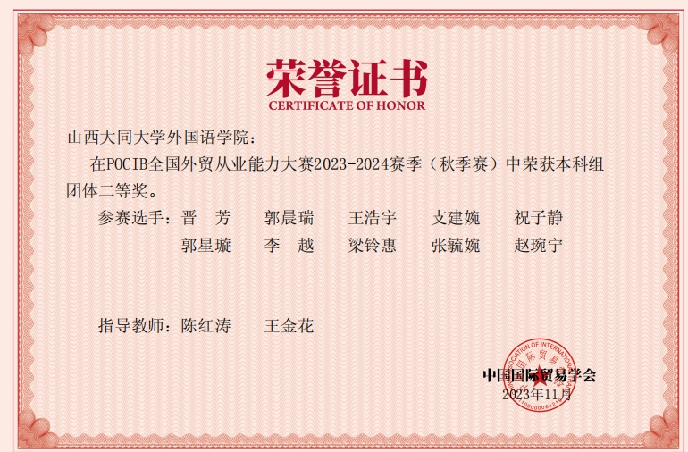 11月2日到11月14日,為期12天的第十三屆POCIB全國(guó)外貿(mào)從業(yè)能力大賽落下帷幕。本次大賽由中國(guó)國(guó)際貿(mào)易學(xué)會(huì)主辦,共有來(lái)自全國(guó)的1059支團(tuán)隊(duì)參賽,參賽選手總數(shù)10590人。我校外院商務(wù)英語(yǔ)10位同學(xué)在教師王金花和陳紅濤的精心指導(dǎo)下,榮獲本次大賽本科組團(tuán)體二等獎(jiǎng),其中晉芳同學(xué)榮獲個(gè)人一等獎(jiǎng),郭晨瑞、王浩宇、支建婉和祝子靜同學(xué)榮獲個(gè)人三等獎(jiǎng)。