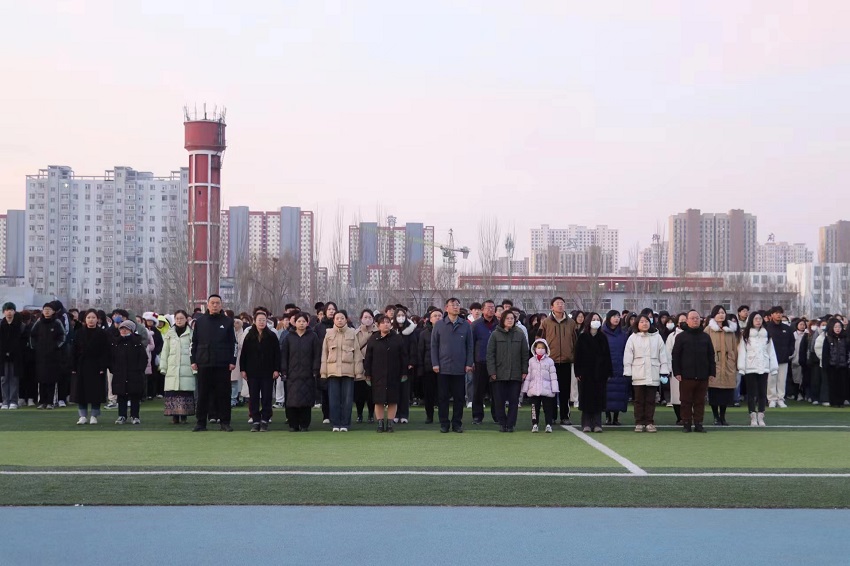 寒風(fēng)凜冽,國旗班的同學(xué)伴隨著《義勇軍進(jìn)行曲》,護(hù)送著國旗來到旗桿下。全體師生目光緊緊追隨著國旗,心中充滿了敬意與自豪。
