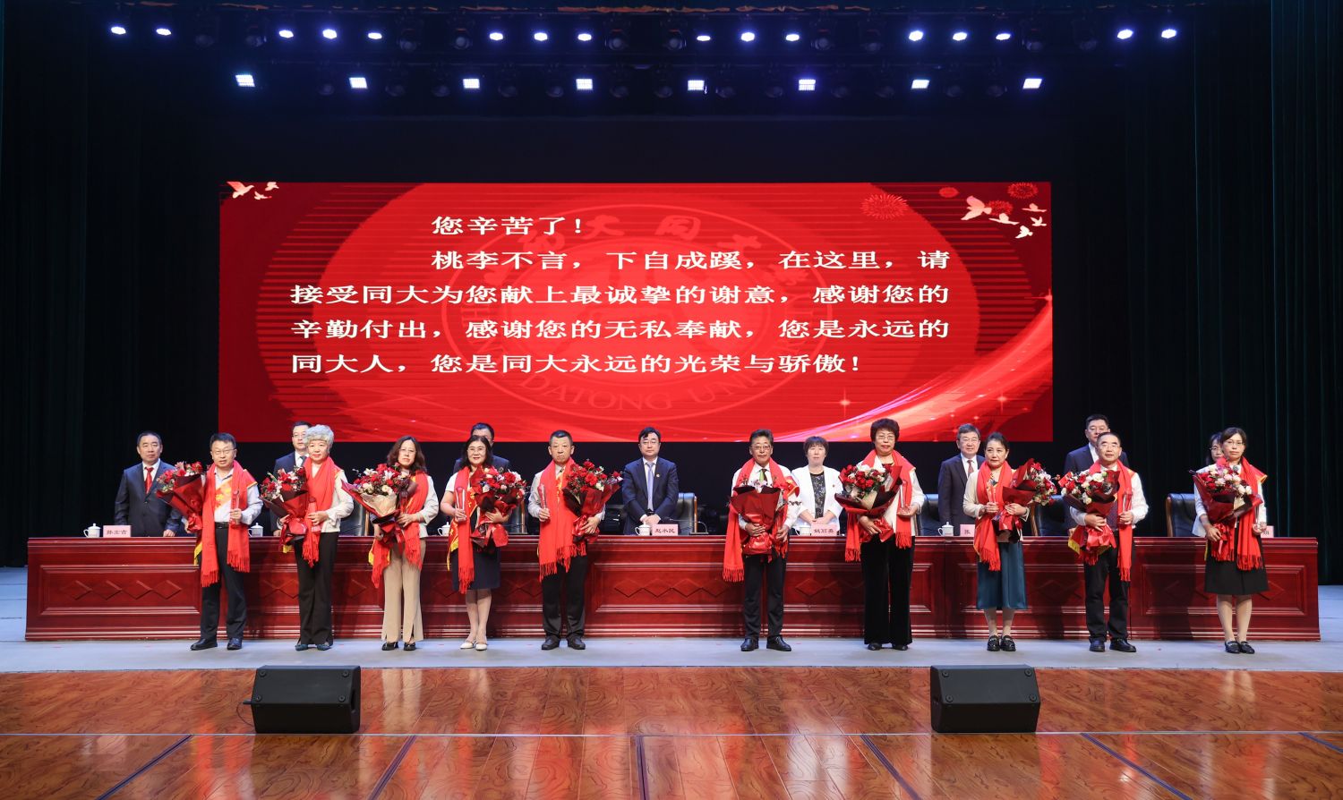 大會為12名退休教師舉行榮退儀式,退休教師上臺領取榮退證書,并接受新教師和學生代表獻禮、獻花。“幾十年來,您愛崗敬業(yè)、默默耕耘、無私奉獻……您是永遠的同大人,您是同大永遠的光榮與驕傲!”情真意切的致敬詞,傾訴著學校的真心感謝與誠摯祝福。