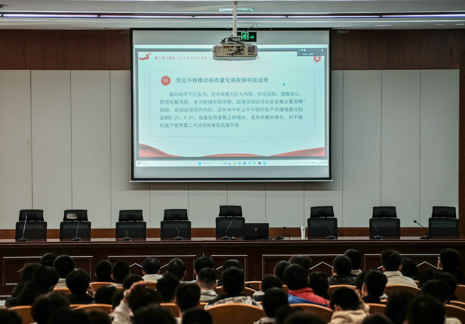 趙水民圍繞“深入學習領會習近平總書記在黨的二十屆三中全會上的重要講話精神”“黨的二十屆三中全會的亮點”“堅定踐行全過程人民民主”“青春為中國式現代化挺膺擔當”,介紹和解讀黨的二十屆三中全會精神,勉勵同學們在新的歷史起點上,開闊人生格局、錘煉過硬本領、做好未來規劃,奮力書寫為中國式現代化挺膺擔當的青春篇章。