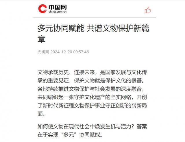 文物承載歷史、連接未來,是國家發(fā)展與文化傳承的重要見證,保護(hù)文物就是保護(hù)文化的根基。各地持續(xù)推進(jìn)文物保護(hù)與社會發(fā)展的深度融合,共同編織起一張守護(hù)文化遺產(chǎn)的堅實網(wǎng)絡(luò),開創(chuàng)了新時代新征程文物保護(hù)事業(yè)守正創(chuàng)新的嶄新局面。