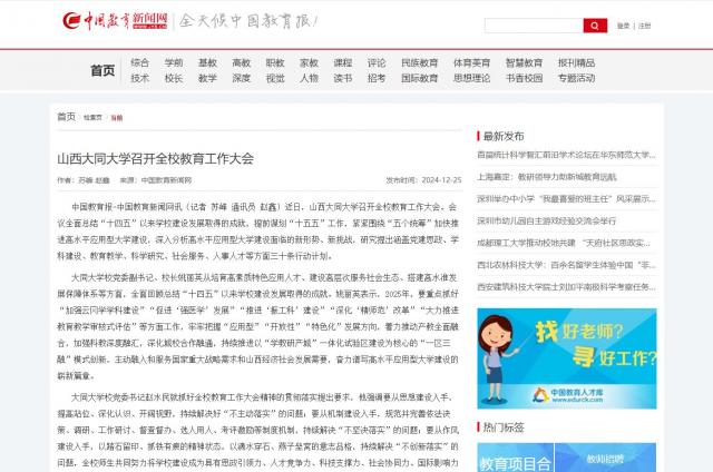 中國教育報-中國教育新聞網訊(記者 蘇峰 通訊員 趙鑫)近日,山西大同大學召開全校教育工作大會。會議全面總結“十四五”以來學校建設發(fā)展取得的成就,提前謀劃“十五五”工作,緊緊圍繞“五個統(tǒng)籌”加快推進高水平應用型大學建設,深入分析高水平應用型大學建設面臨的新形勢、新挑戰(zhàn),研究提出涵蓋黨建思政、學科建設、教育教學、科學研究、社會服務、人事人才等方面三十條行動計劃。