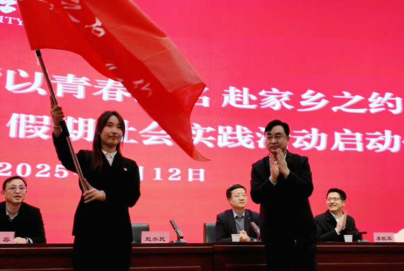 趙水民宣布山西大同大學“以青春之名赴家鄉之約”大學生“思源行”假期社會實踐活動啟動,并為學生代表授旗。