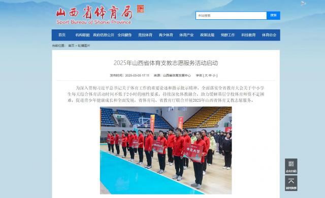 為深入貫徹習近平總書記關于體育工作的重要論述和指示批示精神,全面落實全省教育大會關于中小學生每天綜合體育活動時間不低于2小時的剛性要求,持續深化體教融合,助力緩解基層學校體育師資不足困難,促進青少年健康成長和全面發展,省體育局、省教育廳聯合開展2025年山西省體育支教志愿服務。