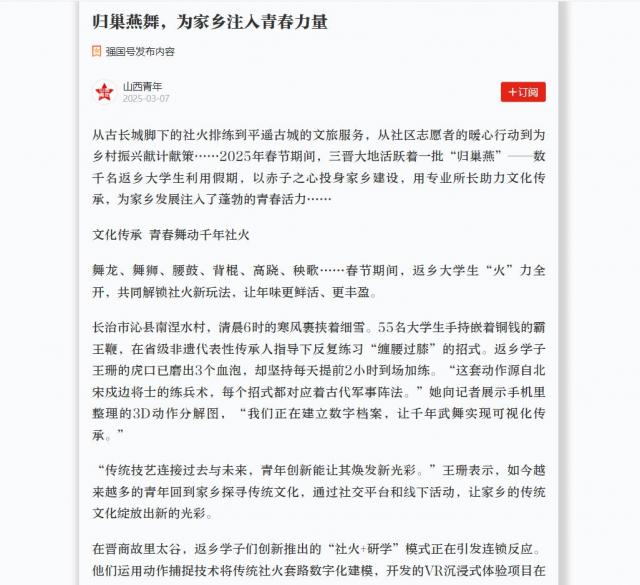 從古長城腳下的社火排練到平遙古城的文旅服務(wù),從社區(qū)志愿者的暖心行動到為鄉(xiāng)村振興獻(xiàn)計獻(xiàn)策……2025年春節(jié)期間,三晉大地活躍著一批“歸巢燕”——數(shù)千名返鄉(xiāng)大學(xué)生利用假期,以赤子之心投身家鄉(xiāng)建設(shè),用專業(yè)所長助力文化傳承,為家鄉(xiāng)發(fā)展注入了蓬勃的青春活力……