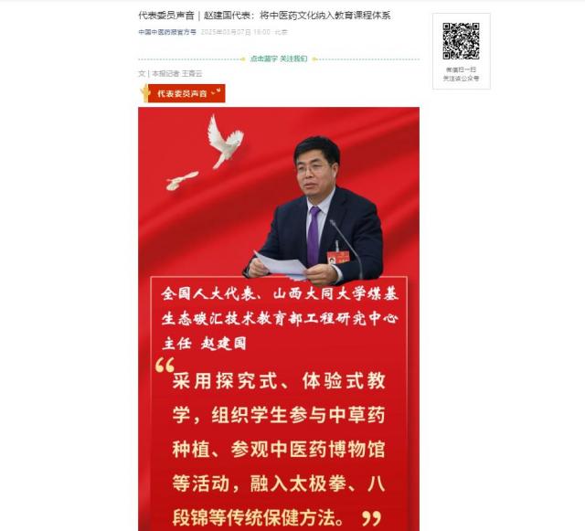 “將中醫藥理療保健知識納入中小學教育課程體系,對傳承中華優秀傳統文化、增強文化自信、培養全面發展的人才具有重要意義?!比珖舜蟠?、山西大同大學煤基生態碳匯技術教育部工程研究中心主任趙建國說。