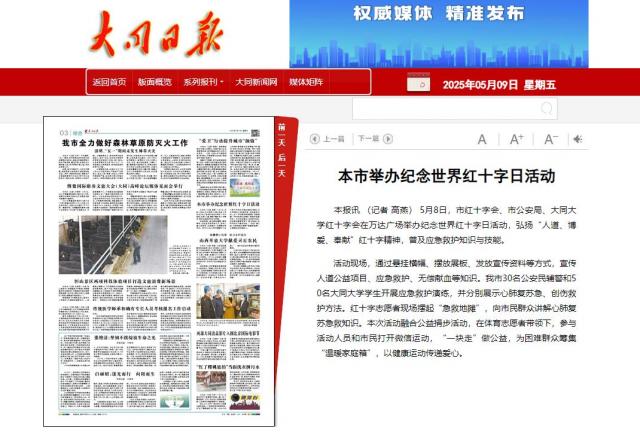 本報訊(記者 高燕)5月8日,市紅十字會、市公安局、大同大學紅十字會在萬達廣場舉辦紀念世界紅十字日活動,弘揚“人道、博愛、奉獻”紅十字精神,普及應急救護知識與技能。