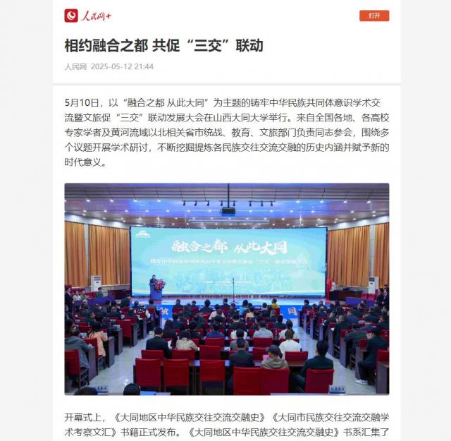 5月10日,以“融合之都從此大同”為主題的鑄牢中華民族共同體意識學術交流暨文旅促“三交”聯動發展大會在山西大同大學舉行。來自全國各地、各高校專家學者及黃河流域以北相關省市統戰、教育、文旅部門負責同志參會,圍繞多個議題開展學術研討,不斷挖掘提煉各民族交往交流交融的歷史內涵并賦予新的時代意義。