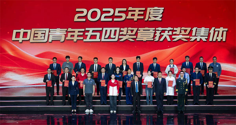 4月30日,2025年度中國青年五四獎章獲獎集體代表在頒獎活動上合影。新華社記者才揚攝