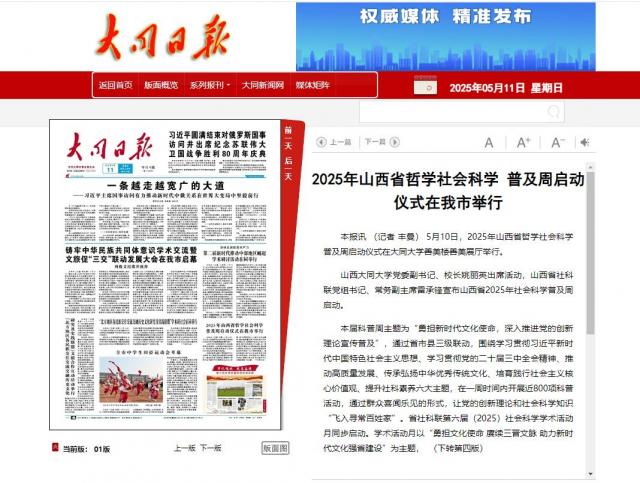 本報訊(記者 豐曼)5月10日,2025年山西省哲學社會科學普及周啟動儀式在大同大學善美樓善美展廳舉行。