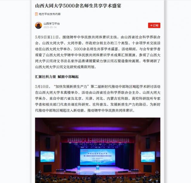 5月9日至11日,圍繞鑄牢中華民族共同體意識主線,由山西省社會科學界聯合會,山西大同大學,大同市委、市政府分別主辦的三個類型、十余項學術交流活動在山西大同大學舉辦,5000余名師生共享學術盛宴。活動期間,與會專家學者觀看了山西大同大學鑄牢中華民族共同體意識學術成果匯報展演,參觀了山西大同大學云岡詩文書法名家作品邀請展暨梁力強云岡石窟造像繪畫展,考察調研了山西大同大學云岡文化研究成果陳列館。